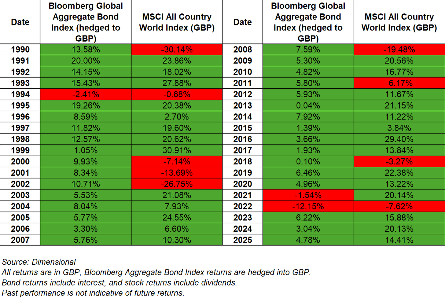 The table above (which I’ve put together in the past and updated this week) shows the calendar year returns for bonds and stocks. Since 1990 bonds have only generated negative returns in 3 out of 36 calendar years. The global stock market did a little worse, generating negative returns in 9 out of 36 calendar years.